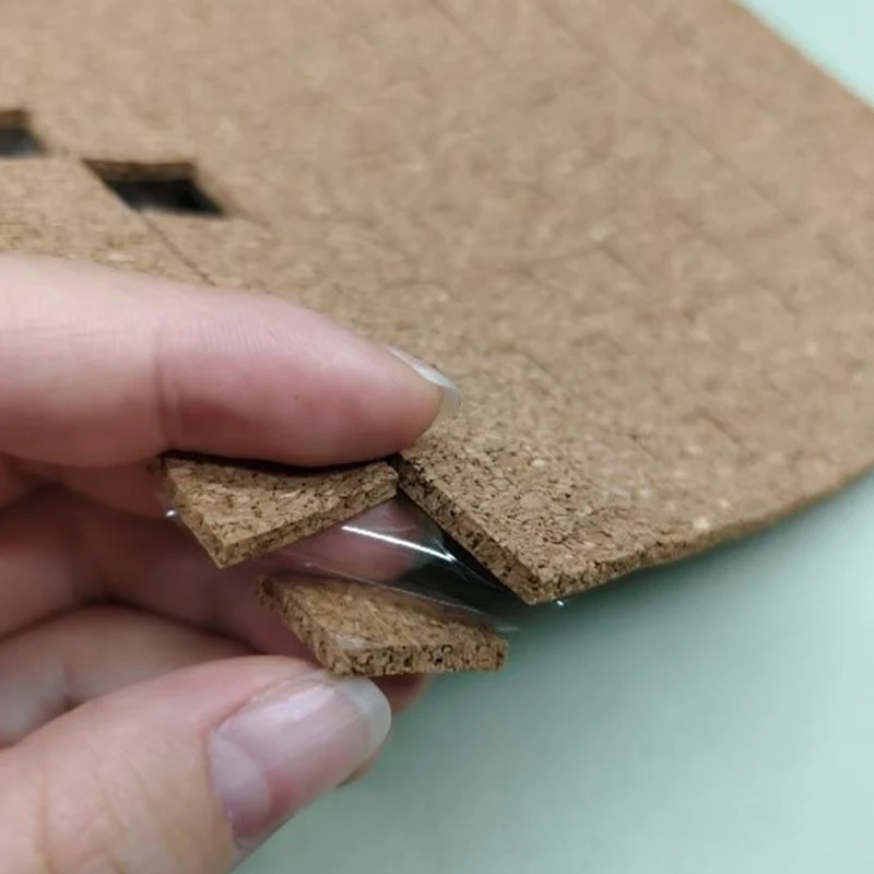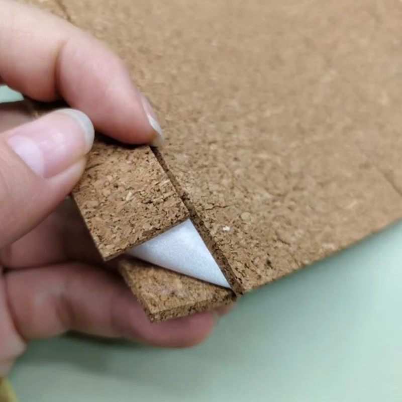 1/8" x 3/4" x 3/4" transportne blazinice iz plute z oprijemljivo podlago, sestavljene predvsem iz plute in odstranljivega lepila ter papirja ali prozornega PET kot obloge na zadnji strani, pakirane v škatli v obliki listov ali zvitkov, kot je prikazano spodaj: